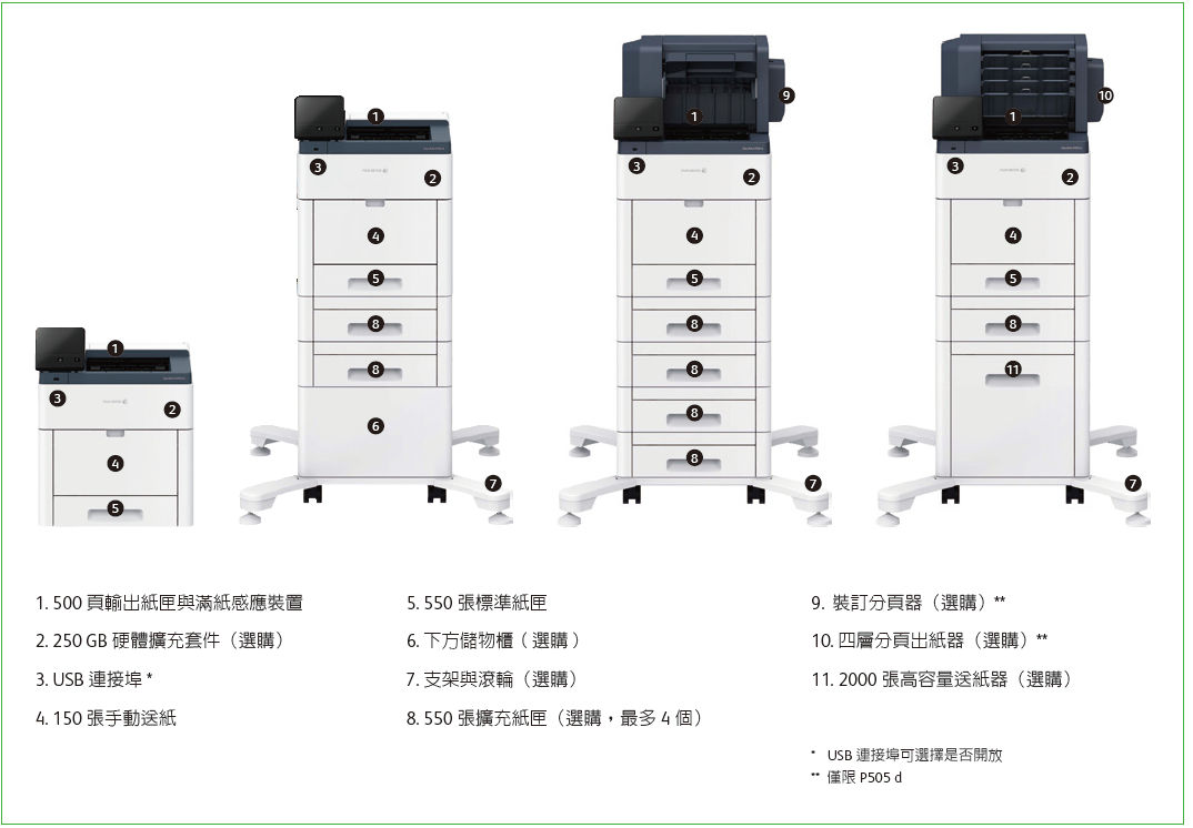 DocuPrint P505 d / CP505 d 提供多功能、多樣化的各種配件,可彈性組合最符合需求現(xiàn)況的列印設(shè)備,發(fā)揮最大文件輸出生產(chǎn)效能。