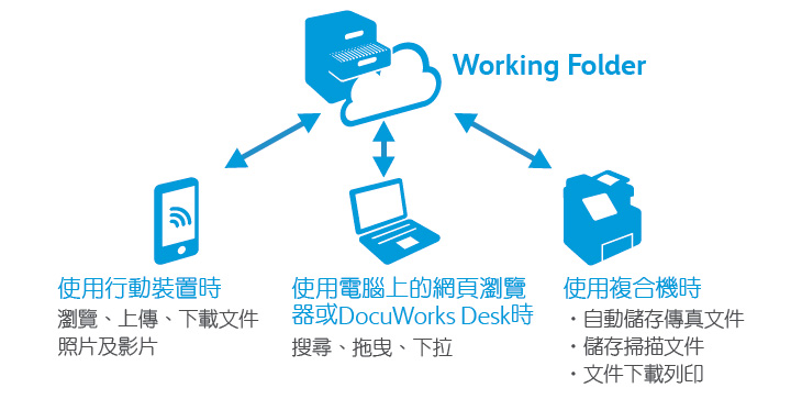 • 行動(dòng)及雲(yún)端整合運(yùn)用 支援Google雲(yún)端列印及AirPrint行動(dòng)列印,下載Fuji XeroxPrint Utility 應(yīng)用程式除列印外,更可經(jīng)由無(wú)線(xiàn)網(wǎng)路將書(shū)面文件掃描至行動(dòng)裝置上。透過(guò)Working Folder選購(gòu)功能(富士全錄雲(yún)端服務(wù)),經(jīng)安全性及權(quán)限控管,授權(quán)使用者儘管不在公司內(nèi),亦可連上網(wǎng)路,將文件掃描上傳、下載傳真、或列印檔案至辦公室內(nèi)的複合機(jī)。