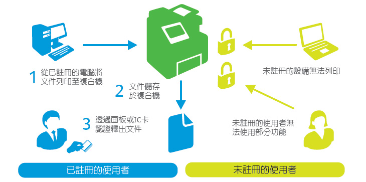 • 使用者認(rèn)證管理 內(nèi)建權(quán)限控管功能可管理至多1000名使用者,文件送出後可先暫存於複合機(jī)硬碟中,直至文件所有者於機(jī)器上輸入密碼才進(jìn)行列印。亦可透過(guò)原廠(chǎng)內(nèi)嵌式(選購(gòu))或外接式讀卡機(jī)(選購(gòu))進(jìn)行身份認(rèn)證,對(duì)各使用者可用功能及彩色輸出等權(quán)限進(jìn)行管制。