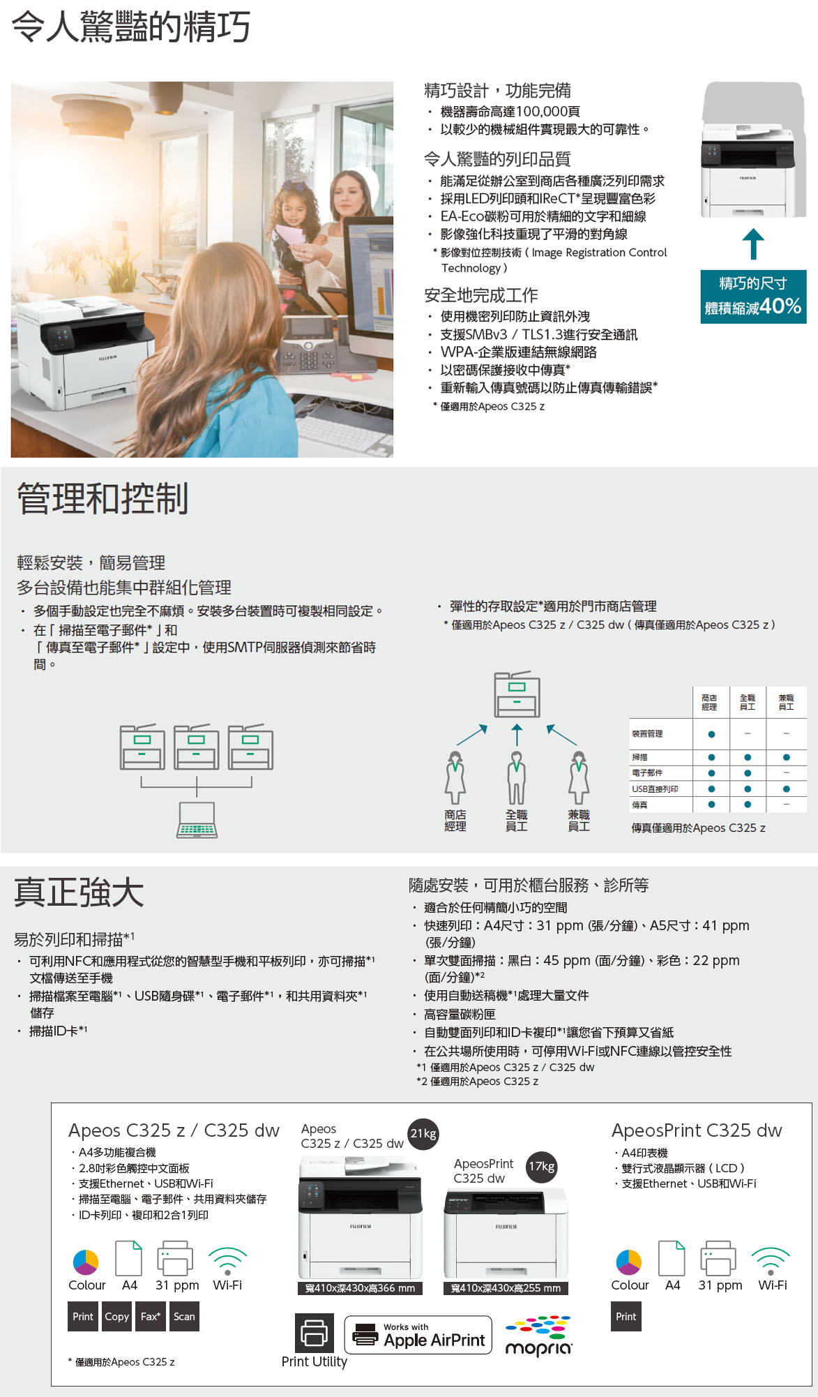 桌上型多功能複合機(jī) Apeos C325 dw 字體大小 縮小字體 加大字體 列印 Email Apeos C325dw 將您所需全集於一身 奪目的色彩和細(xì)緻的黑白列印品質(zhì),讓人信賴和高度的安全性 ? 發(fā)佈於 桌上型多功能複合機(jī) 此分類更多內(nèi)容: DocuPrint CM405df » 返回頂部